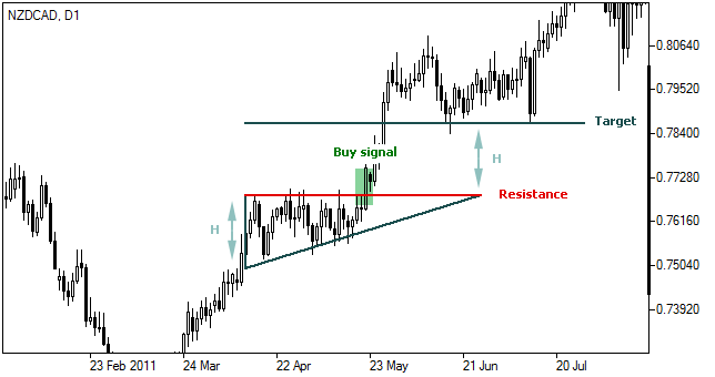To trade an ascending triangle, you can look for a strong volume surge and a candlestick close above the resistance level. You can then enter a long position and set your stop loss below the most recent low. You can also use the height of the triangle as a target for your profit.